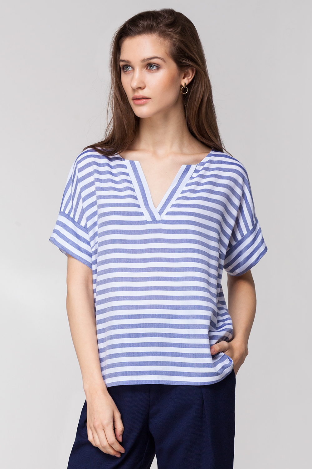 Топ прямого силуэта с цельнокроенным рукавом с широкой манжетой. Горловина с V-образным вырезом. Оригинальности изделию придают асимметрично расположенные полосы .