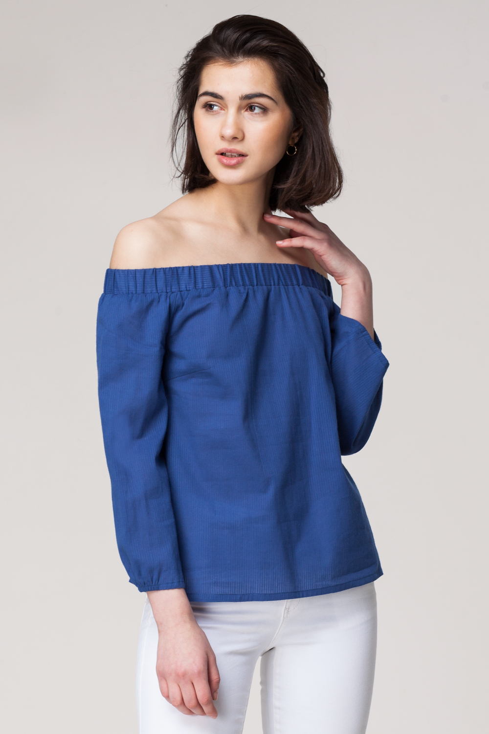 Ультрамодная блузка с открытой линией плеч выполнена из фактурного хлопкового полотна. Широкие рукава 3/4 частично собраны на резинку для создания эффектного объёма.