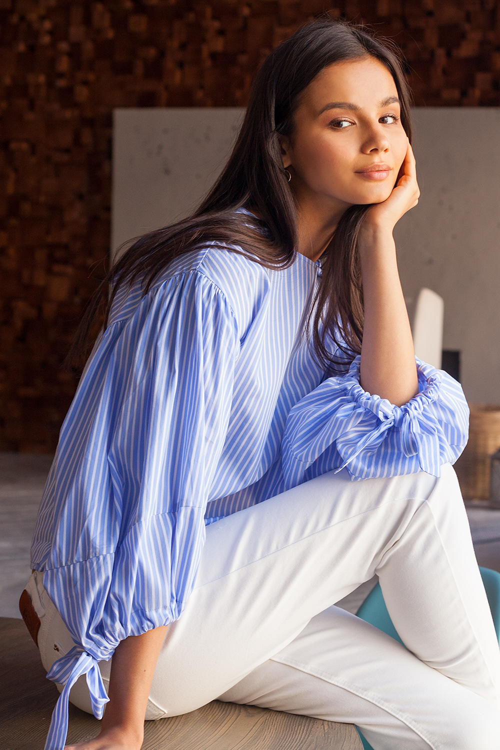 Блуза свободного силуэта выполнена из хлопка в бело-голубую полоску. Рукав-баллон дополнен кулиской с завязками для создания эффектного объема.