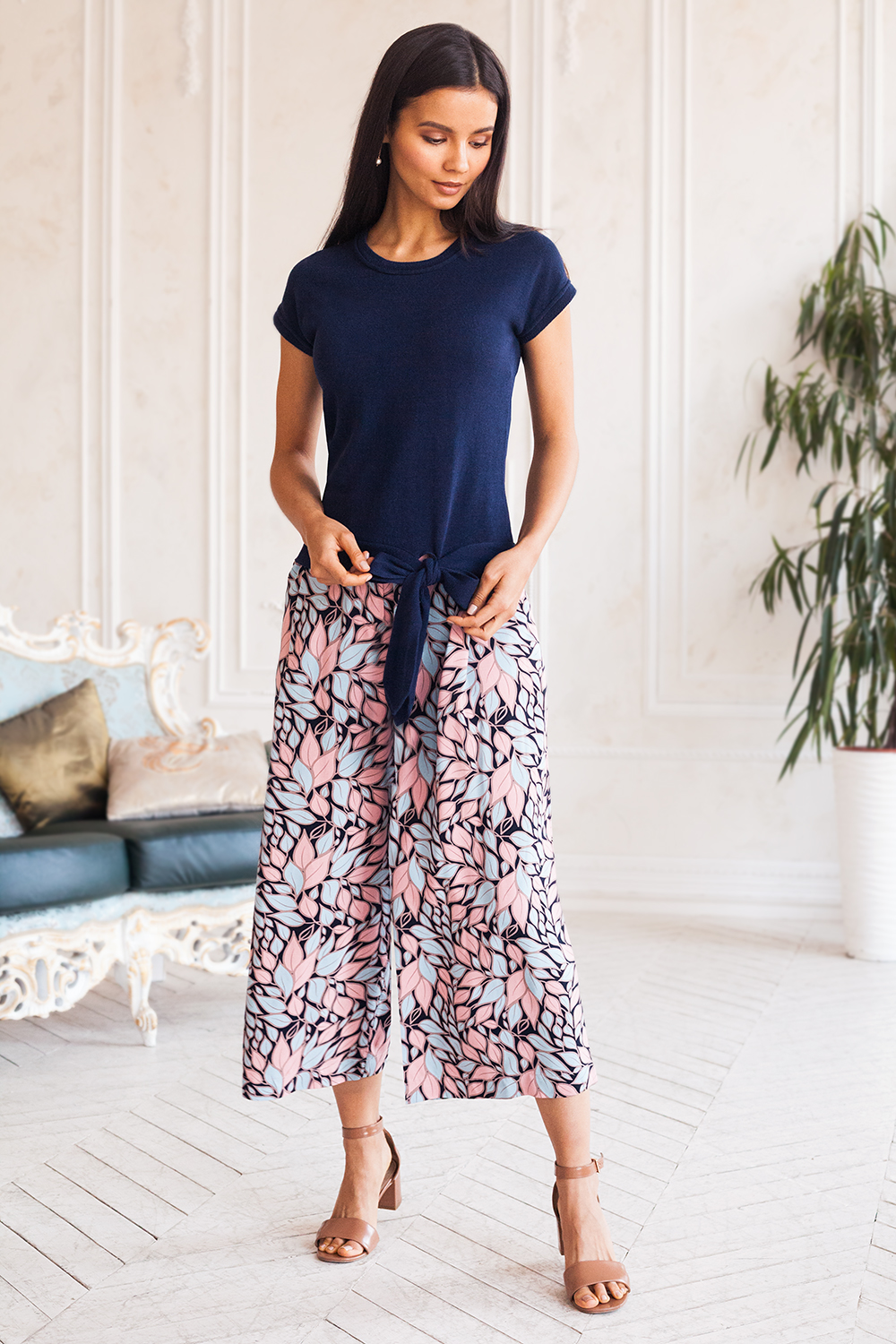 Кюлоты выполнены из штапельной вискозы с растительным принтом. Посадка на талии, широкие брючины со складками. Классическая брючная застежка на молнию и крючок, спереди наклонные карманы.