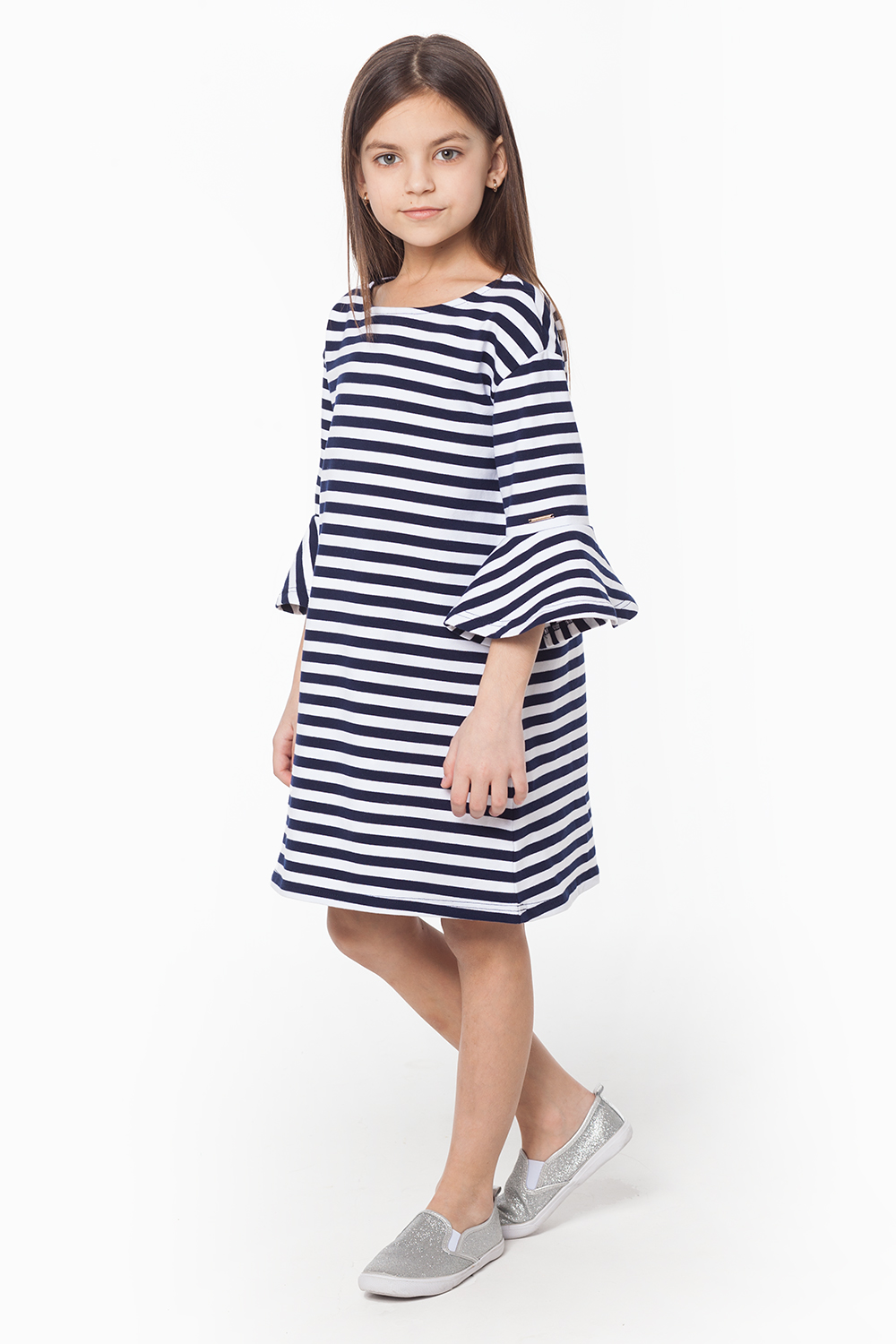 Платье свободного кроя выполнено из эластичного двухниточного футера. Модель со спущенным плечом и воланом по низу рукава.