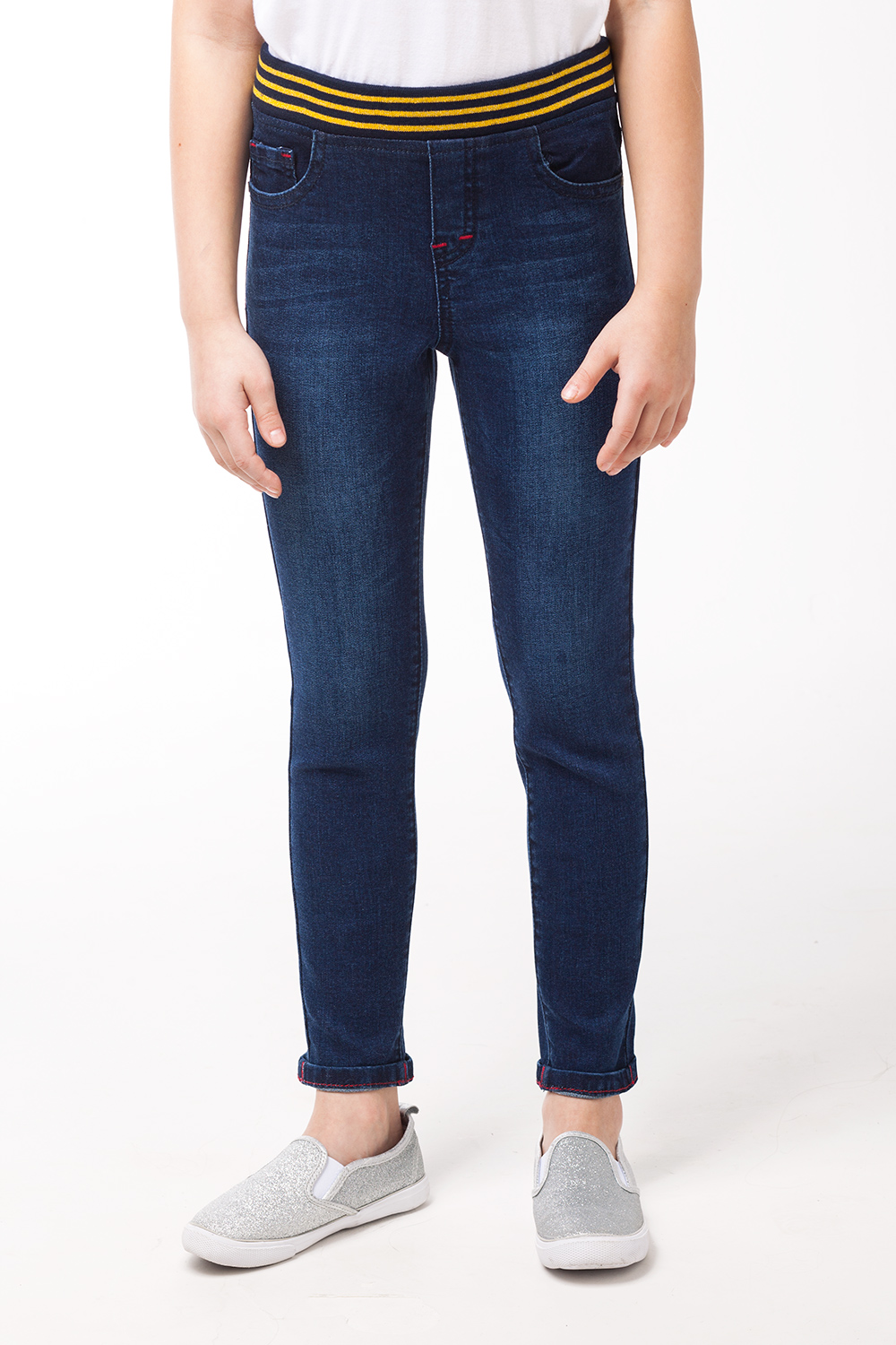 Джеггинсы выполнены из эластичного темно-синего денима с небольшими декоративными потертостями. Пояс из полосатой рибаны на резинке. Джинсовый покрой с 5 карманами, декоративные отстрочки контрастного цвета, низ изделия с отворотом.