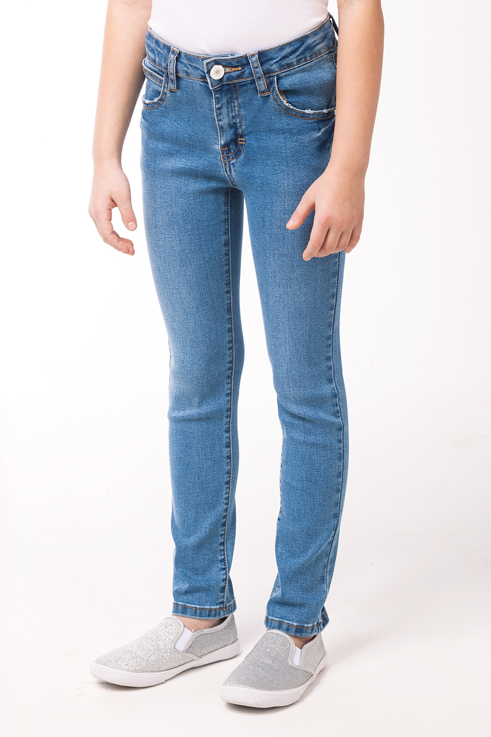 Джинсы-скинни выполнены из эластичного светло-синего денима. Покрой с 5 карманами и декоративными потертостями. Задний карман дополнен контрастной нашивкой.