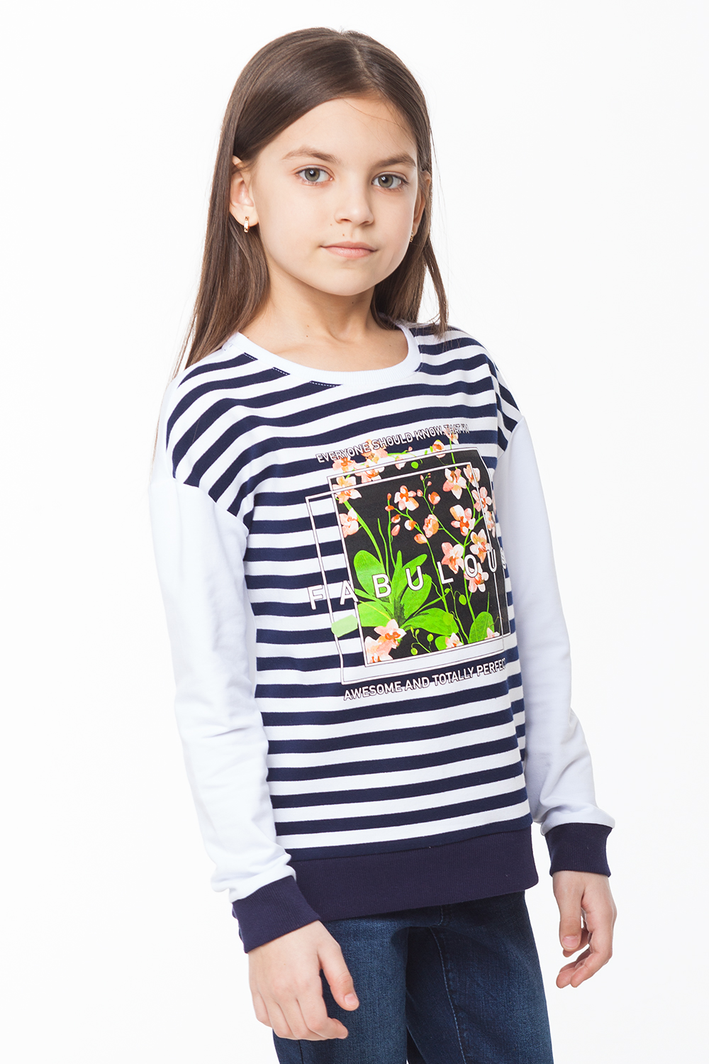 Свитшот свободного кроя выполнен из эластичного двухниточного футера. Низ изделия и манжеты из рибаны, спереди декоративный принт.