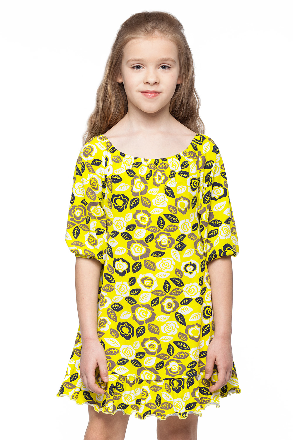 Платье выполнено из эластичного хлопкового полотна с цветочным принтом. Изделие свободного силуэта, низ изделия декорирован широким, пышным воланом. Округлый вырез горловины и манжеты на резинке.