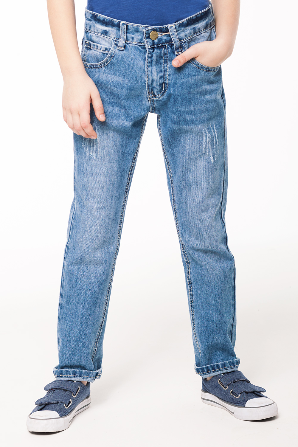 Классические джинсы прямого кроя выполнены из светло-синего денима. Изделие со стиркой и легкими потертостями.