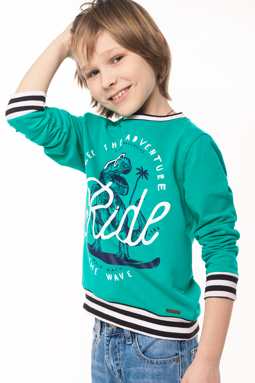 Свитшот для мальчика выполнен из эластичного двухниточного футера. Низ изделия, горловина и манжеты из вязанной полосатой рибаны. Спереди декоративный принт и нашивка с логотипом.
