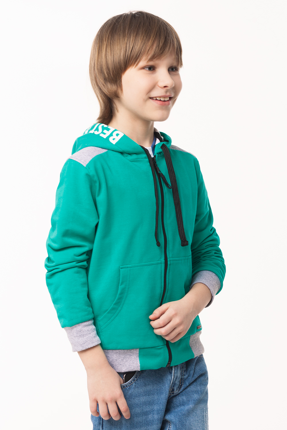 Толстовка с застежкой на молнию выполнена из эластичного двухниточного футера. Низ изделия и манжеты из рибаны. Капюшон на эффектной полосатой подкладке дополнен кулиской с хлопковым шнурком. Спереди накладные карманы и нашивка с логотипом.