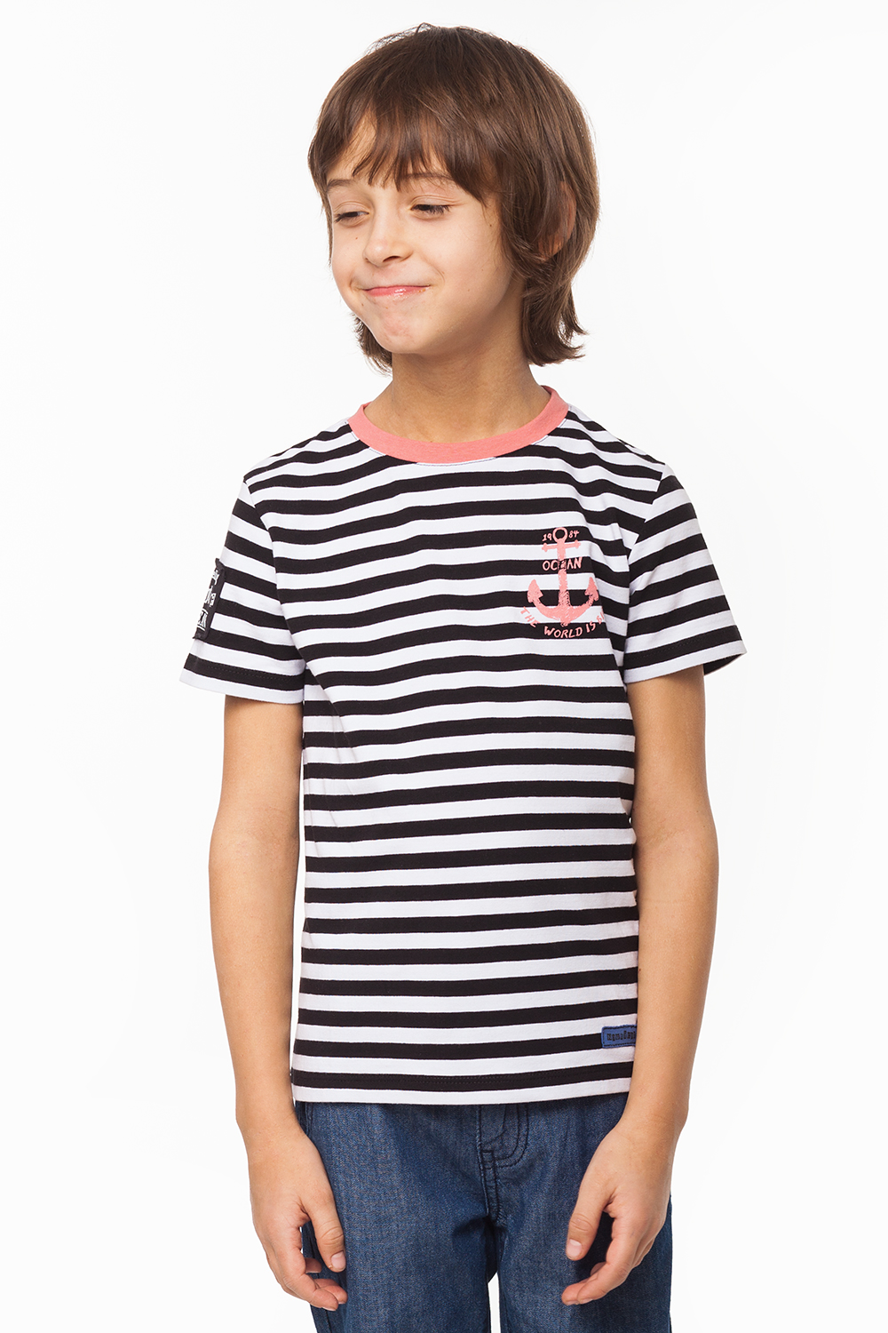 Футболка выполнена из эластичного хлопкового трикотажа горловиной из контрастной рибаны. Модель дополнена принтом и декоративными нашивками.