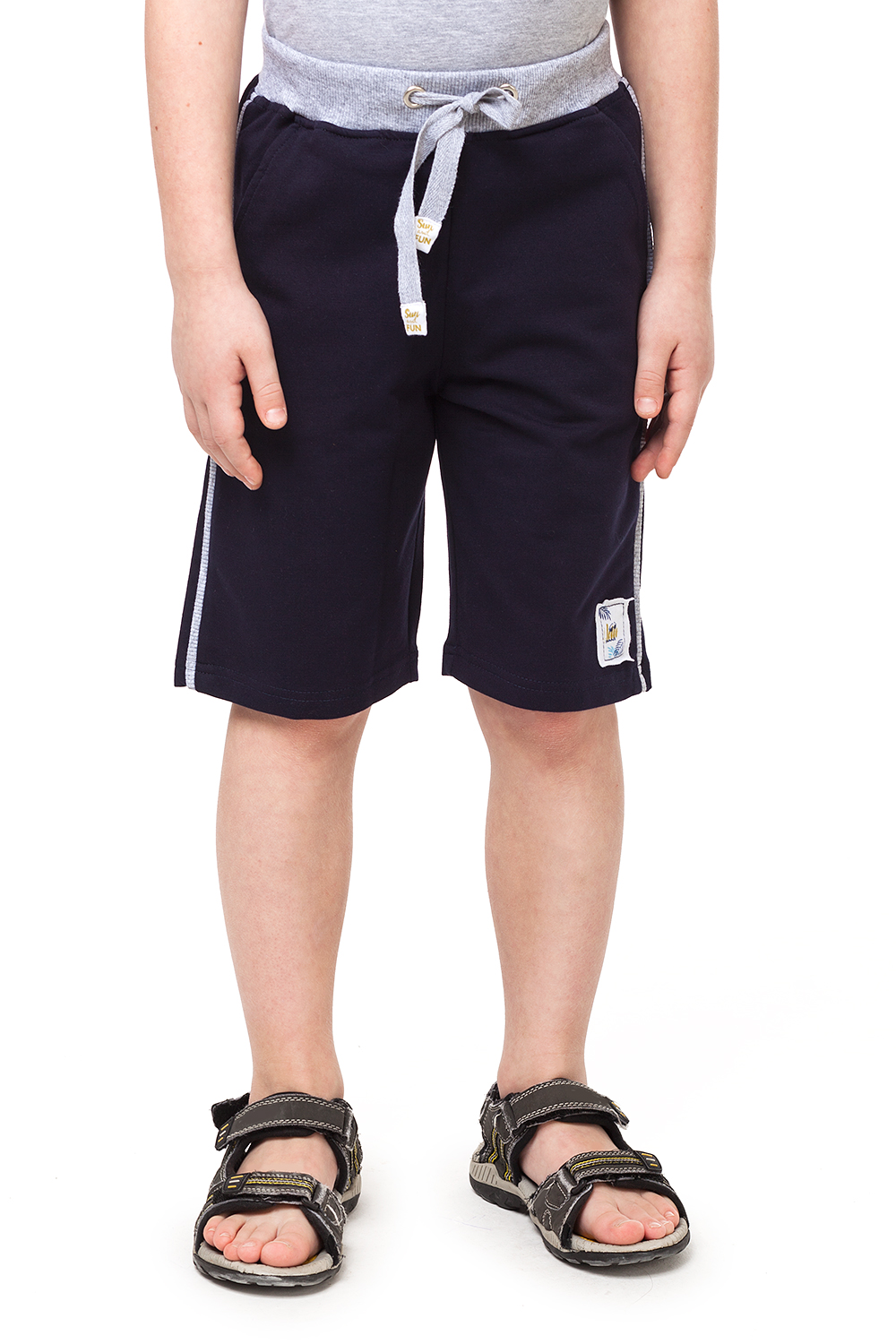 Спортивные шорты для мальчика выполнены из плотного эластичного хлопкового полотна. Притачной пояс из контрастного кошкорсе на резинке и с завязкой на тесемку. Боковые боковые карманы, сзади прорезной карман с листочкой. Снизу на штанине декоративная наши