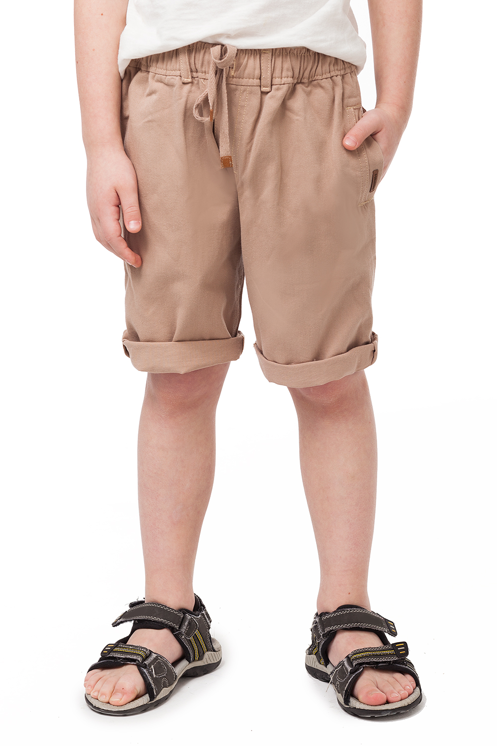 Шорты для мальчика выполнены из плотной хлопковой ткани. Изделие дополнено эффектом стирки. Пояс на резинке с завязкой на шнурок. Спереди боковые карманы с листочкой, сзади накладные клапаны. Наконечники шнура и нашивкой с логотипом из искусственной кожи.