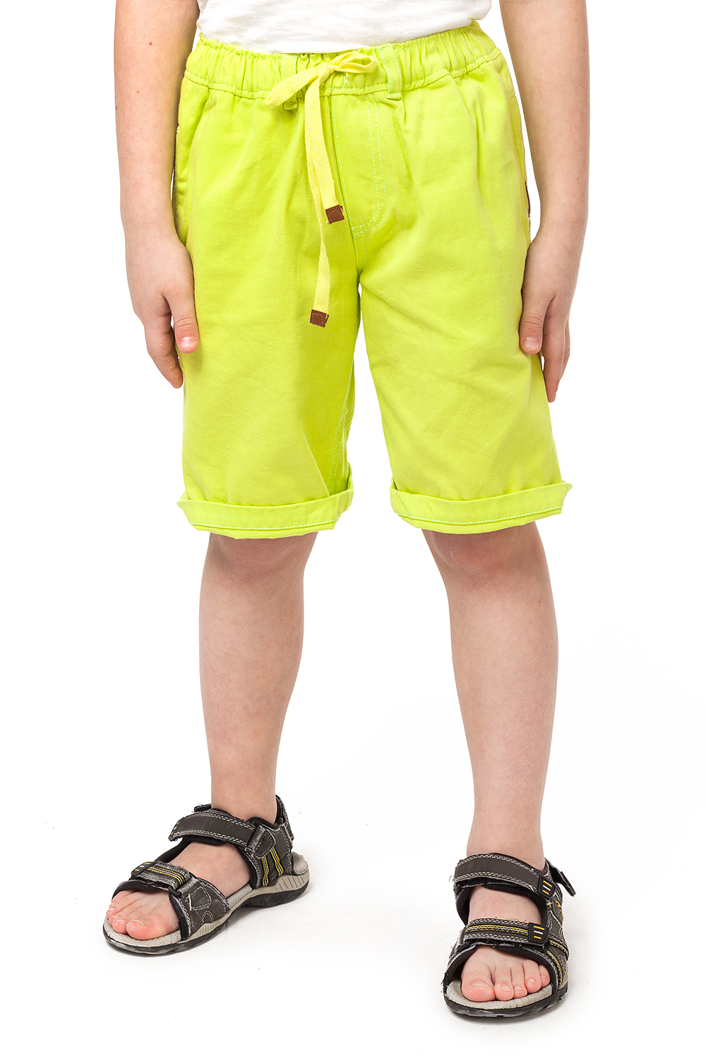 Шорты для мальчика выполнены из плотной хлопковой ткани. Изделие дополнено эффектом стирки. Пояс на резинке с завязкой на шнурок. Спереди боковые карманы с листочкой, сзади накладные клапаны. Наконечники шнура и нашивкой с логотипом из искусственной кожи.