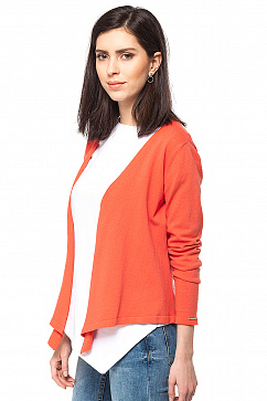 Приталенный жакет с драпированной планкой и асимметричной линией низа. Изделие связано из эластичного хлопковой пряжи. На манжете декоративная металлическая нашивка с логотипом.