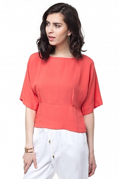 Укороченная блузка из штапельного вискозного полотна с легким эффектом жатости. Изделие приталенного силуэта с отрезным поясом и широким рукавом "летучая мышь". Ассиметричная спинка с декоративной молнией. Блузка станет эффектной альтернативой классическим летним топам в повседневных и деловых образах.