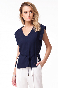 Блузка с V-образным вырезом изготовлена из плотного вискозного полотна с легким эффектом жатости, вставки по бокам изделия и пройме рукава - из вязаного "лапшой" трикотажа. Спереди высокие боковые разрезы. Талия с завязкой на тонкий пояс из основного мате