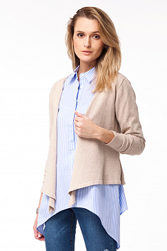 Приталенный жакет с драпированной планкой и асимметричной линией низа. Изделие связано из эластичной хлопковой пряжи. На манжете декоративная металлическая нашивка с логотипом.
