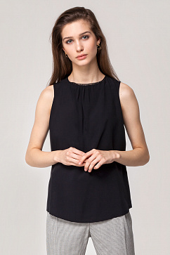 Блузка свободного покроя выполнена из тонкого вискозного полотна. Спереди мелкие складки-сборки от горловины, сзади глубокий узкий вырез с поперечной отделочной деталью. Горловина изделия дополнена декоративной тесьмой, сзади завязки-ленты.