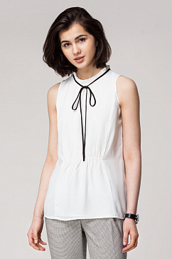 Блузка полуприлегающего силуэта выполнена из фактурного поливискозного полотна. Передняя часть двухслойная, на талии декоративная сборка на резинку. Горловина изделия дополнена оборками и узкой контрастной завязкой на бант, сзади застежка на пуговицу.