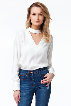 Блузка с трендовым сочетанием глубокого V-образного выреза и воротника-стойки. Изделие свободного силуэта выполнено из штапельного вискозного полотна. Сзади воротник застегивается на пуговицы.