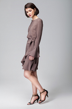 Платье приталенного силуэта выполнено из мягкой пластичной креповой ткани. Эффектный запах с широким поясом завязывается на бант. Низ изделия и рукава дополнены широкими воланами. В больших размерах длина за колено.