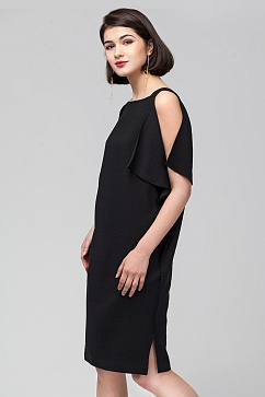 Элегантное платье свободного кроя с заужением к низу выполнено из мягкой пластичной креповой ткани. Модель дополнена эффектными драпировками от линии плеч.