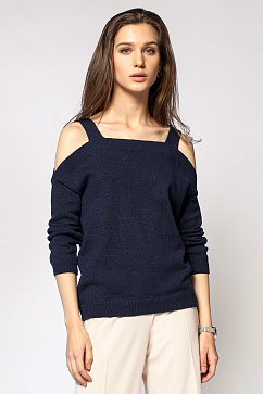 Джемпер с открытыми плечами выполнен из вязаного трикотажа с добавлением нити люрекса. Модель свободного силуэта со спущенным рукавом позволит создать комфортный и трендовый образ.
