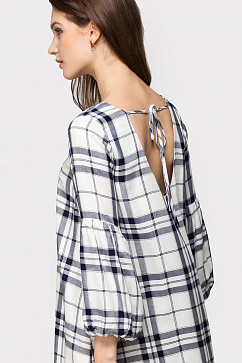 Платье свободного трапециевидного кроя. На спинке глубокий вырез с завязкой-шнуром. Рукав 3/4, притачная нижняя часть на подкладке, для придания рукаву эффектного объема.