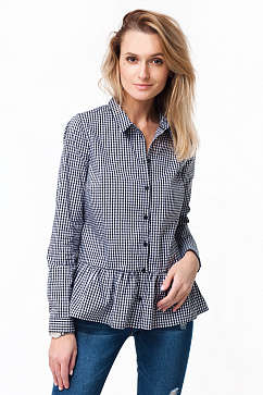 Блуза прямого силуэта выполнена из эластичного хлопкового полотна в мелкую клетку <<Виши>>. Рубашечный крой с отложным воротничком и застежкой на планку на пуговицы дополнен широкой баской со сборками.