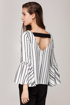 Блуза А-силуэта выполнена из плотного вискозного полотна с оригинальным принтом. Укороченные рукава дополнены широкими объёмными воланами. Вырез на спинке дополнен планкой контрастного цвета.