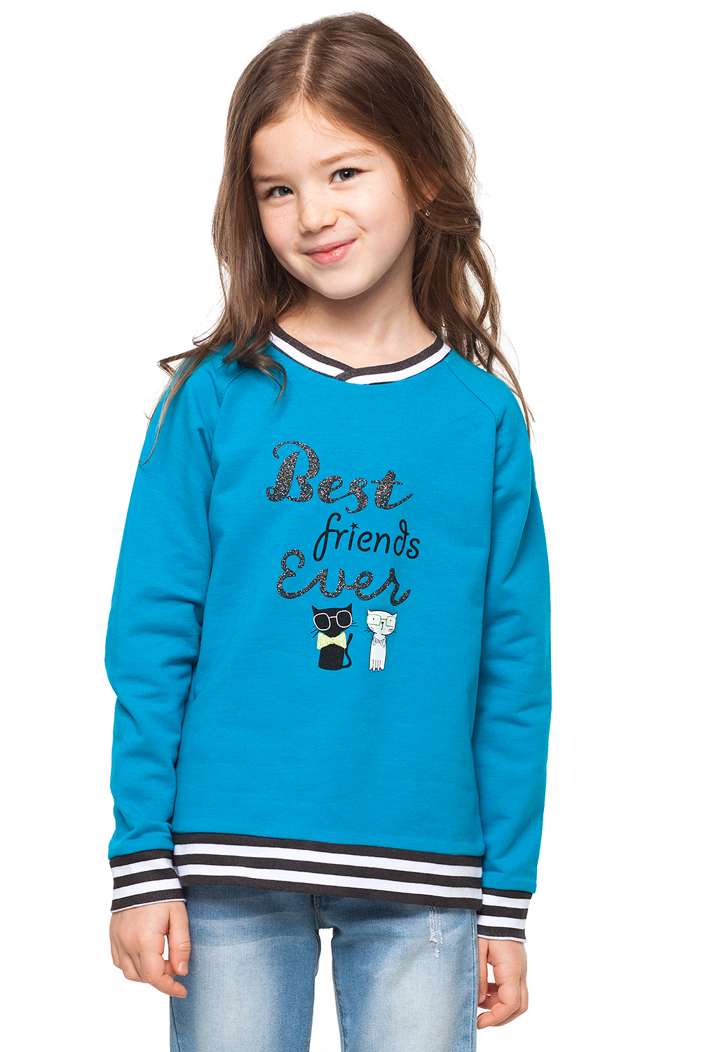 Толстовка для девочки из эластичного футера. Спереди декоративный принт с глиттером. Манжеты, пояс и горловина изделия выполнены из полосатой рибаны.