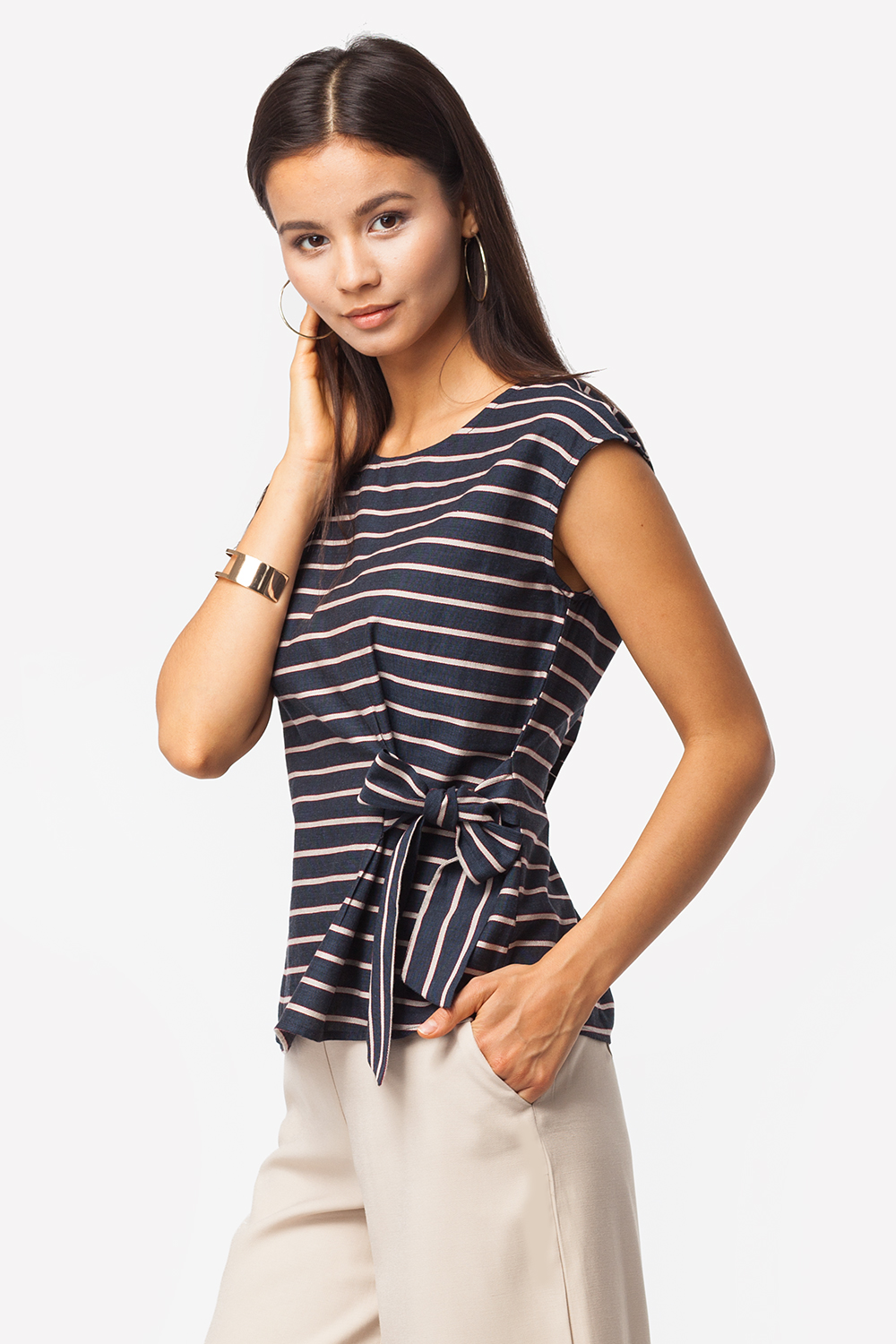 Блуза прямого силуэта выполнена из хлопкового полотна в фактурную полоску. Изделие со спущенным плечом и округлым вырезом горловины. Широкие ленты на поясе завязываются на декоративный бант.