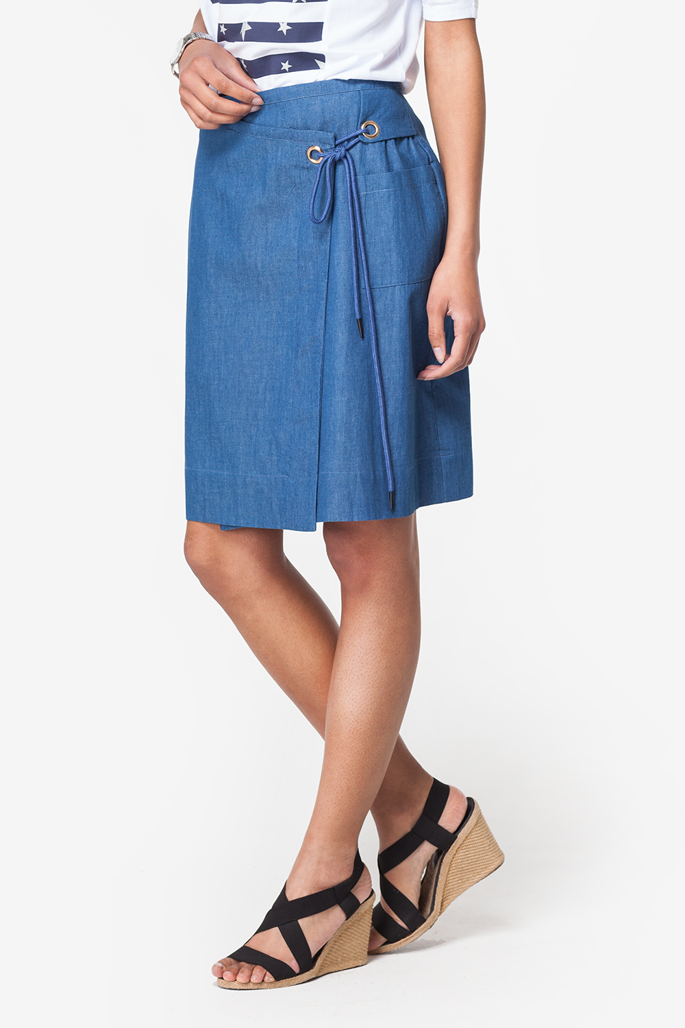 Юбка с запАхом выполнена из плотного хлопкового полотна. Трапециевидный крой, застежка на скрытую пуговицу и шнуровку с металлическими люверсами. Модель дополнена накладным карманом.