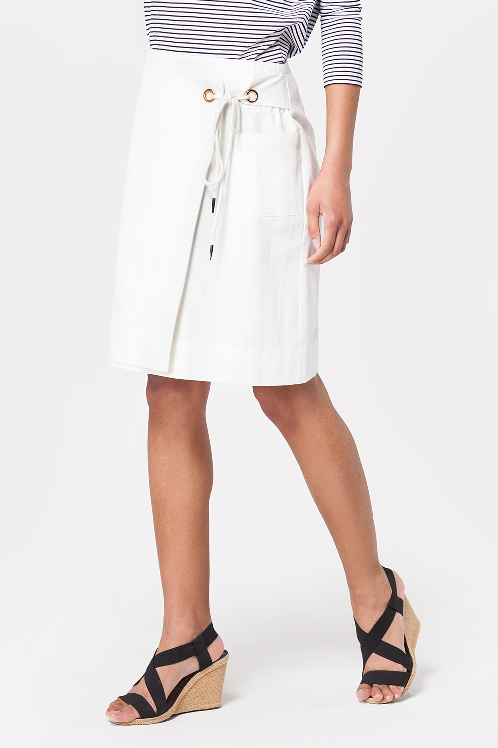 Юбка с запАхом выполнена из плотного хлопкового полотна. Трапециевидный крой, застежка на скрытую пуговицу и шнуровку с металлическими люверсами. Модель дополнена накладным карманом.