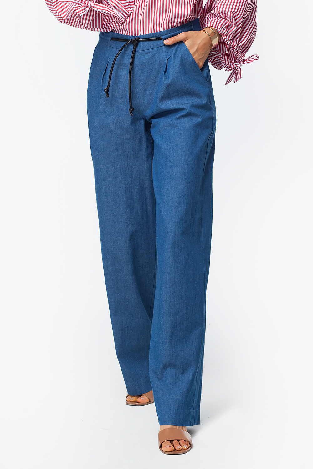 Широкие брюки-палаццо выполнены из хлопкового полотна под деним. Средняя посадка, застежка на потайную молнию в боковом шве. Отрезной пояс спереди дополнен контрастным шнуром из иск. кожи.