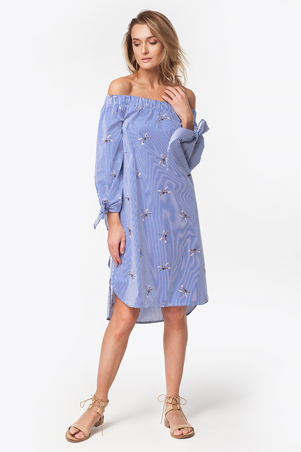 Платье прямого силуэта с удлиненной спинкой и открытой линией плеч. Модель выполнена из эластичного хлопка, верх изделия на широкой резинке. Объемные рукава дополнены лентами-завязками.