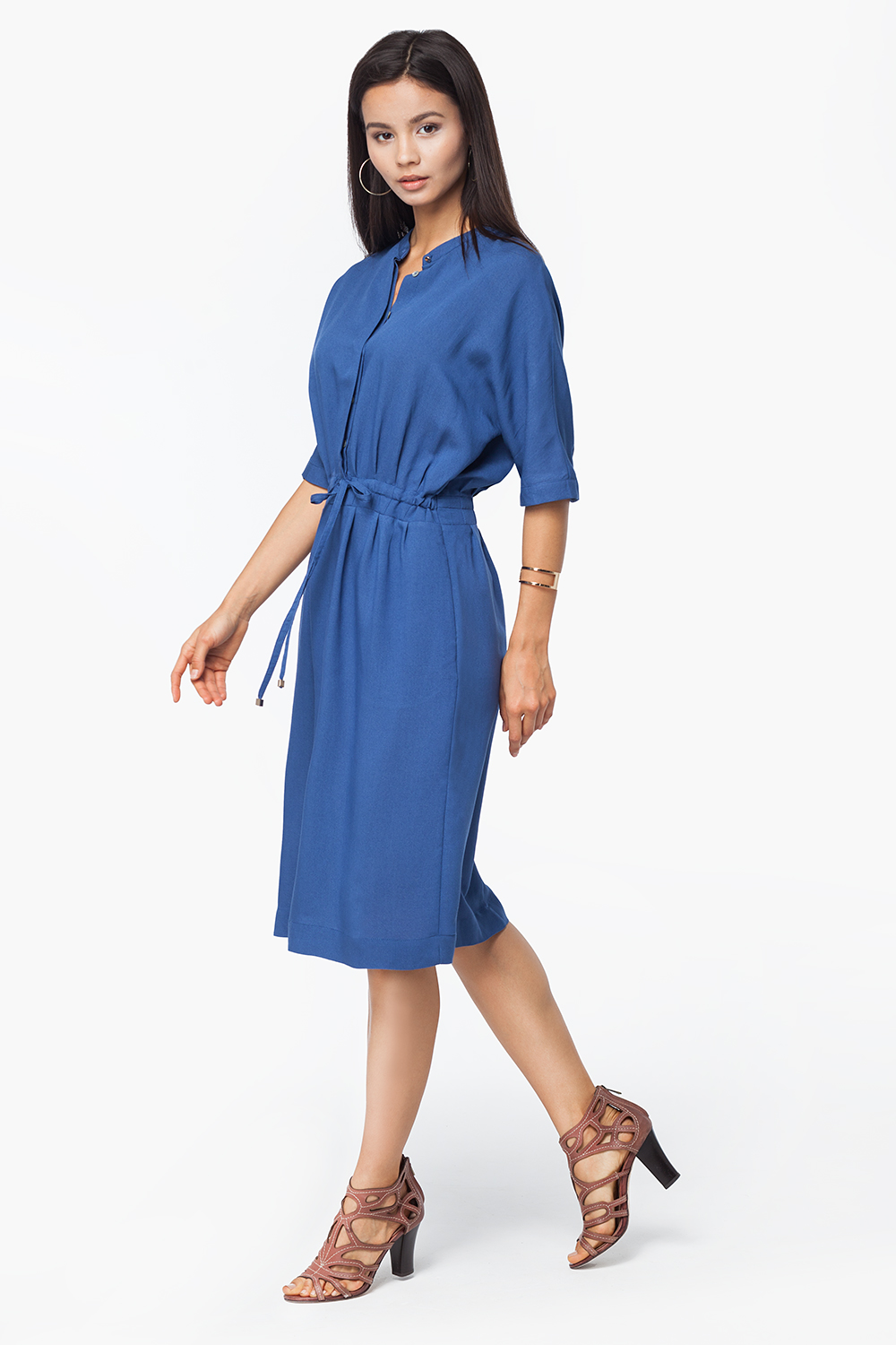 Платье-кимоно полуприлегающего силуэта выполнено из вискозного полотна. Цельнокроеные рукава, линия талии подчеркнута кулиской с завязкой на шнурок. Застежка на планку с перламутровыми пуговицами, карманы в боковых швах.