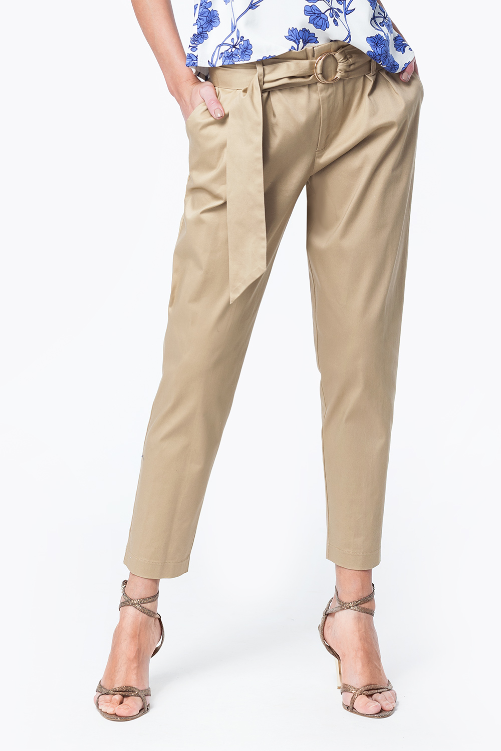 Укороченные свободные брюки выполнены из эластичного хлопкового полотна с легким сатиновым блеском. Средняя посадка, верх с мягкими складками дополнен широким длинным поясом. Спереди наклонные боковые карманы, застежка на гульфик на молнии и потайной крюч