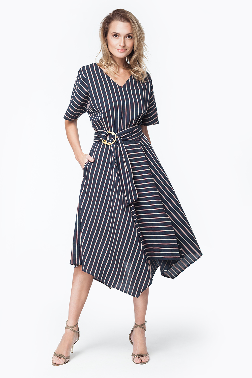 Платье приталенного силуэта выполнено из хлопкового полотна в фактурную полоску. Свободная верхняя часть с цельнокроеным рукавом, юбка асимметричного кроя, талия на резинке. В комплекте съемный пояс из основной ткани с круглыми пряжками из бамбука.