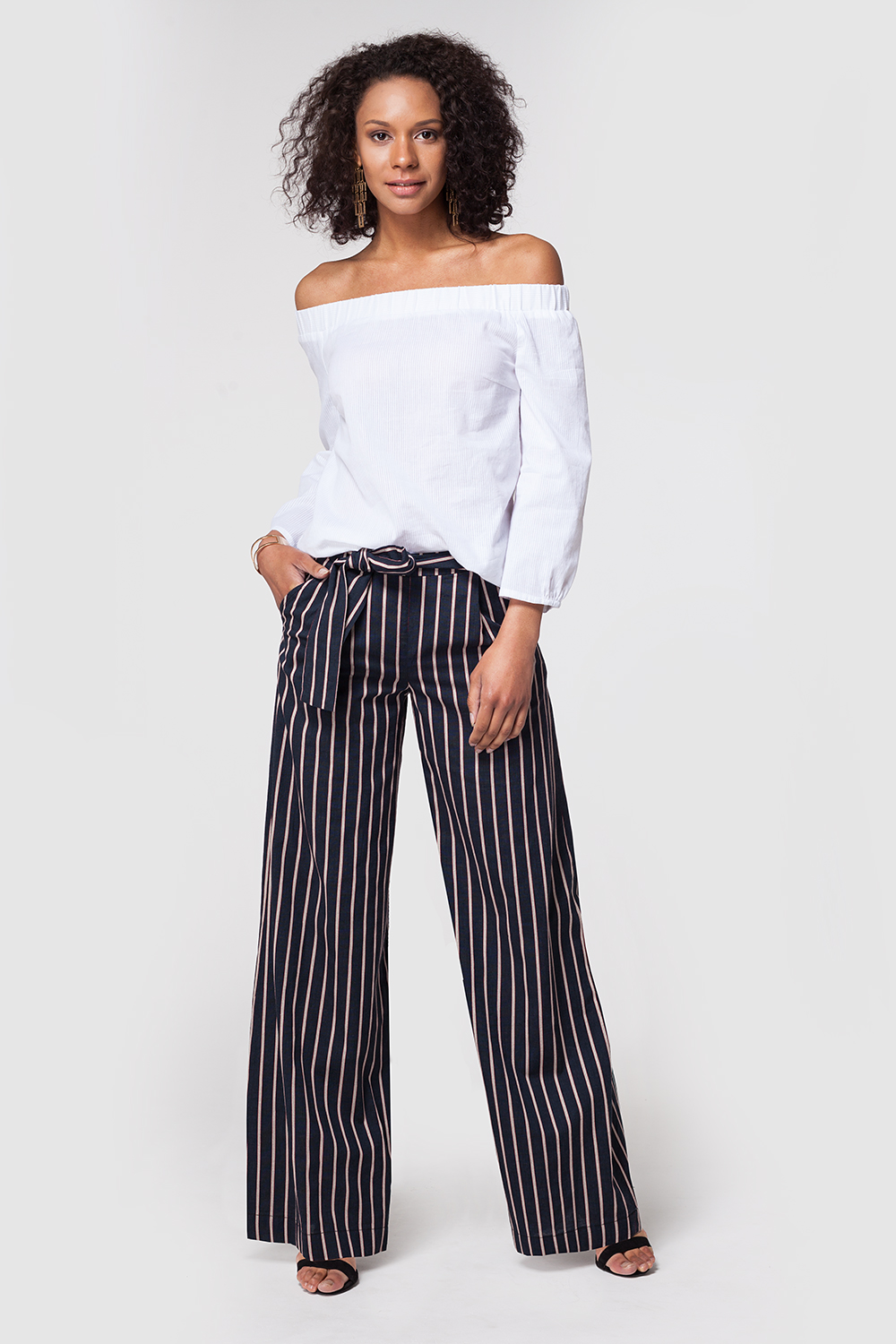 Свободные брюки "палаццо" выполнены из хлопкового полотна в фактурную полоску. Средняя посадка, застежка на потайную молнию в боковом шве. Модель со съемным поясом из основной ткани, спереди наклонные боковые карманы.