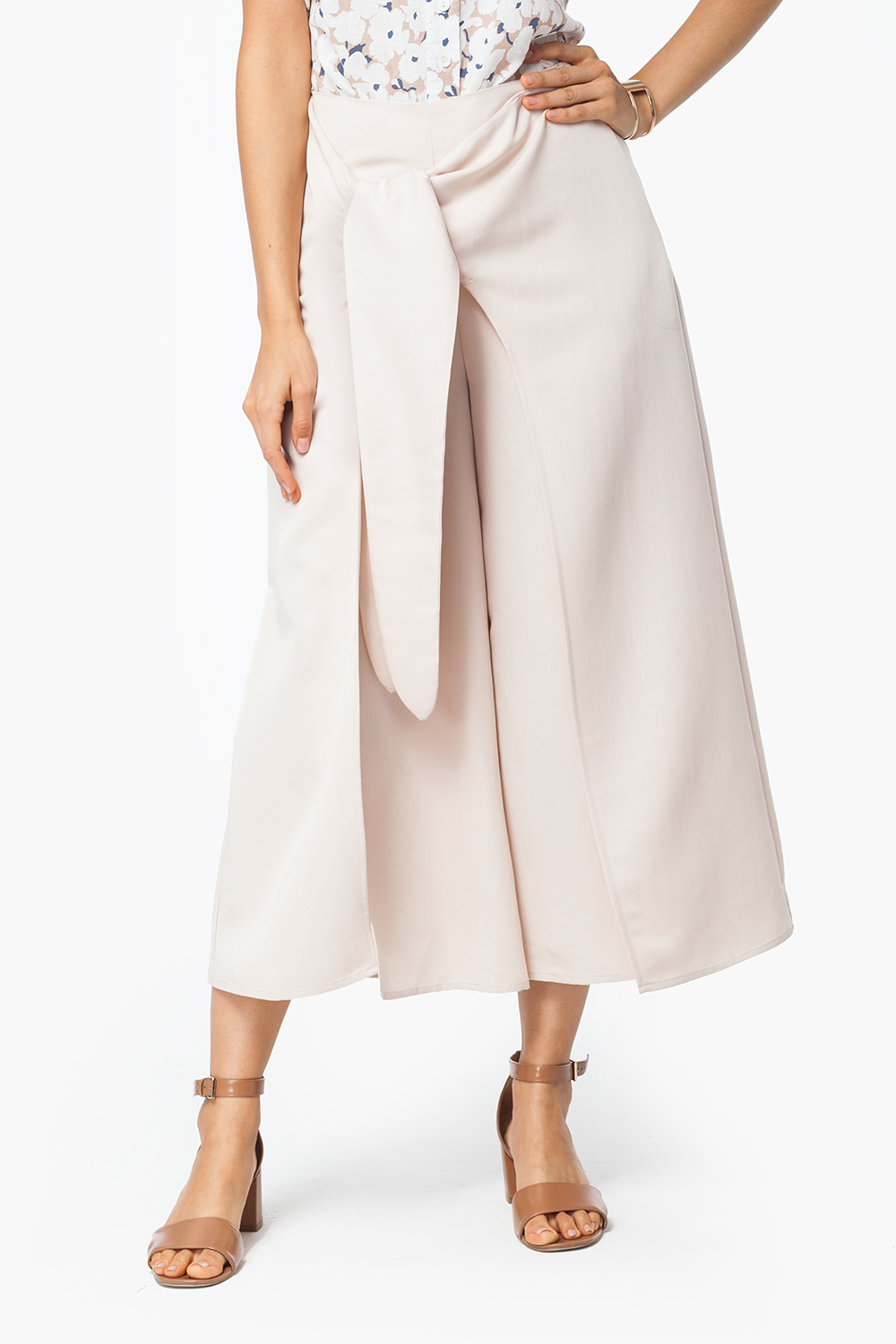 Кюлоты выполнены из мягкого поливискозного полотна. Сложный крой с эффектной драпировкой, запах фиксируется декоративным поясом-бантом. Застежка на потайную молнию в боковом шве.