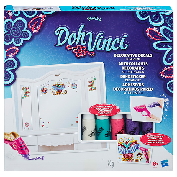 Новый набор для творчества Doh Vinci - это возможность создать украшение для стены своими руками! В набор входит шаблон-стикер, специальный стайлер и 5 картриджей для украшения, некоторые из которых блестящие . Украшать стикер можно на свое усмотрение - создавайте собственный дизайн, используя цвета из набора и дополнительные цвета (если у вас уже есть другие наборы До Винчи). Стикер выполнен в виде витиеватых узоров, некоторые из которых напоминают волшебные растения, бабочек, снежинки. Его легко приклеить на стену. После украшения, масса DohVinci застывает и прочно держится на рисунке.