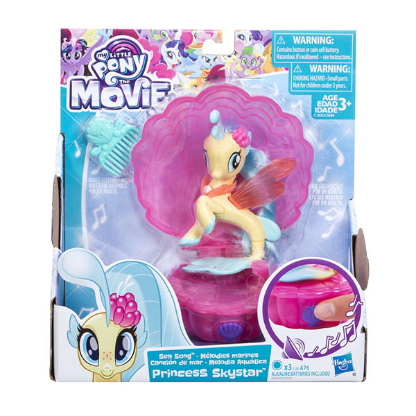 Новая серия игрушек от My Little Pony посвящена выходу полнометражного мультфильма «My Little Pony в кино». Согласно сюжету поняшки весело и беззаботно живут в стране Эквестрии, наполненной музыкой, весельем и дружбой. Но во время одного из праздников в Эквестрию на дирижабле прилетает Король Шторм с намерением ее захватить. Пони будут спасать свой дом от коварного злодея. Их ждут невероятные приключения: они даже побывают в подводном царстве! Игровой набор очень понравится маленькой принцессе. Это же одна из самых любимых героинь — Принцесса Скайстар, она очень веселая и дружелюбная. Отличительные черты персонажа: желтый цвет шерстки, голубые плавники, копытца и грива, на спине розовые крылышки, а на нее она носит очаровательное украшение с жемчугом. В комплекте: Фигурка пони из подводного царства с подвижным, эластичным русалочьим хвостом и мягкой гривой, которую можно расчесывать; Музыкальная раковина в ярко-розовом цвете; Голубой гребешок. Раковина такая красивая, только взгляните! Если нажать на маленькую кнопочку, заиграет музыка. С любимой героиней Скайстар можно играть отдельно, без использования раковины, придумывая самые невероятные сюжеты. А если девочка пожелает, фигурку можно окунать в воду, она выполнена из специального полимерного материала и имеет подвижный эластичный хвостик, как у настоящей русалочки. Вперед навстречу приключениям! Обратите внимание! Для работы игрушки требуются 3 батарейки типа LR44 (A76). Игровой набор находится в картонной коробке открытого типа с функцией Try me, позволяющей проверить работу игрушки без вскрытия упаковки. В комплект входят демонстрационные батарейки, перед игрой их рекомендуется заменить на новые.