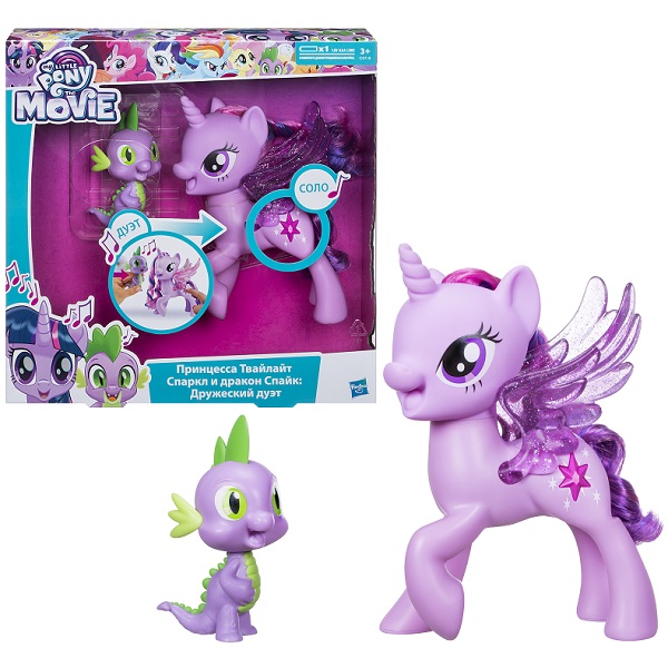 My Little Pony известны девочкам по всему миру благодаря замечательным игрушкам и мультсериалу, который учит детей дружбе. Девочки с удовольствием играют с фигурками пони, куклами, интерактивными игрушками. Представляем вашему вниманию интерактивную Сумеречную Искорку и ее питомца Спайка. Сумеречная искорка – красивый аликорн с рогом как у единорога и крылышками как у пегаса. Она любит читать и разбирается в магии. Искорка фиолетового цвета с розово-фиолетовой мягкой гривой, которую можно расчесывать, и отличительной меткой в виде звездочки. При нажатии на эту метку Искорка начинает петь восхитительную песню. Её питомец Спайк – дракончик. Если поднести его к Искорке, пока она поет, Спайк начнет ей подпевать! С таким замечательным набором можно разыграть множество веселых сценок о приключениях двух друзей. Внимание! Для работы игрушки требуется 1 батарейка типа ААА. Упаковка - картонная коробка открытого типа с функцией Try me, позволяющей проверить работу игрушки без вскрытия упаковки. В комплект входит демонстрационная батарейка, перед игрой ее рекомендуется заменить на новую.