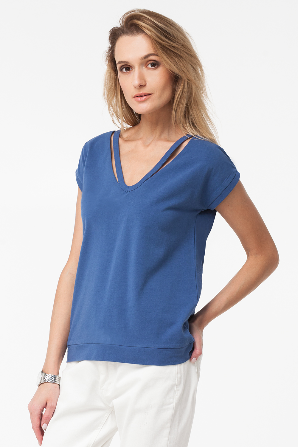 Футболка со спущенным плечом и широким притачным поясом выполнена из эластичного хлопкового полотна. Модель дополнена оригинальным V-образным вырезом горловины с декоративными элементами.
