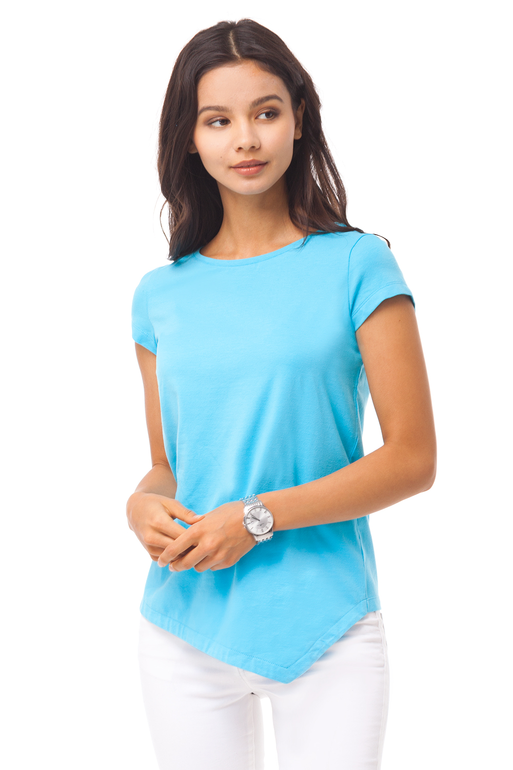 Футболка А-силуэта выполнена из эластичного хлопкового полотна. Модель с коротким втачным рукавом и асимметричным низом.
