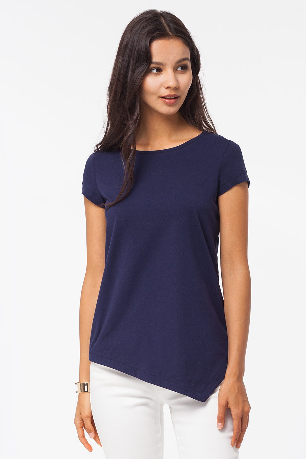 Футболка А-силуэта выполнена из эластичного хлопкового полотна. Модель с коротким втачным рукавом и асимметричным низом.