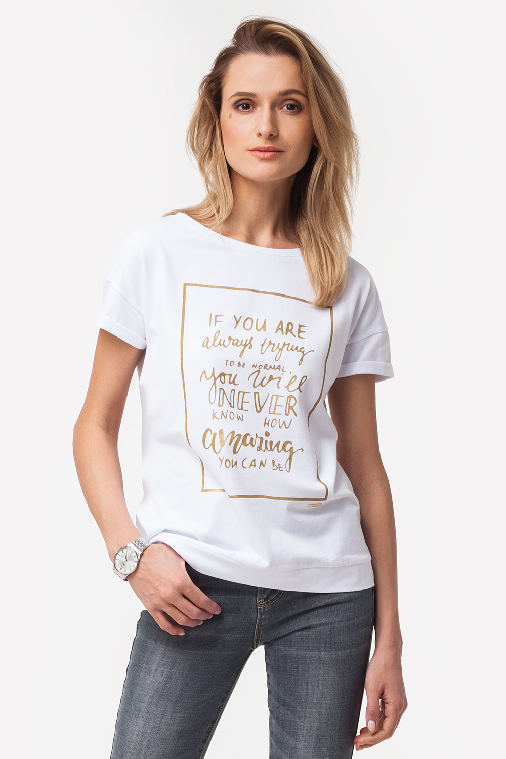 Трикотажная футболка свободного кроя со спущенным плечом и широким притачным поясом. Спереди декоративный принт с легким блеском. Модель выполнена в стиле "family look" вместе с футболкой для девочки F49.388