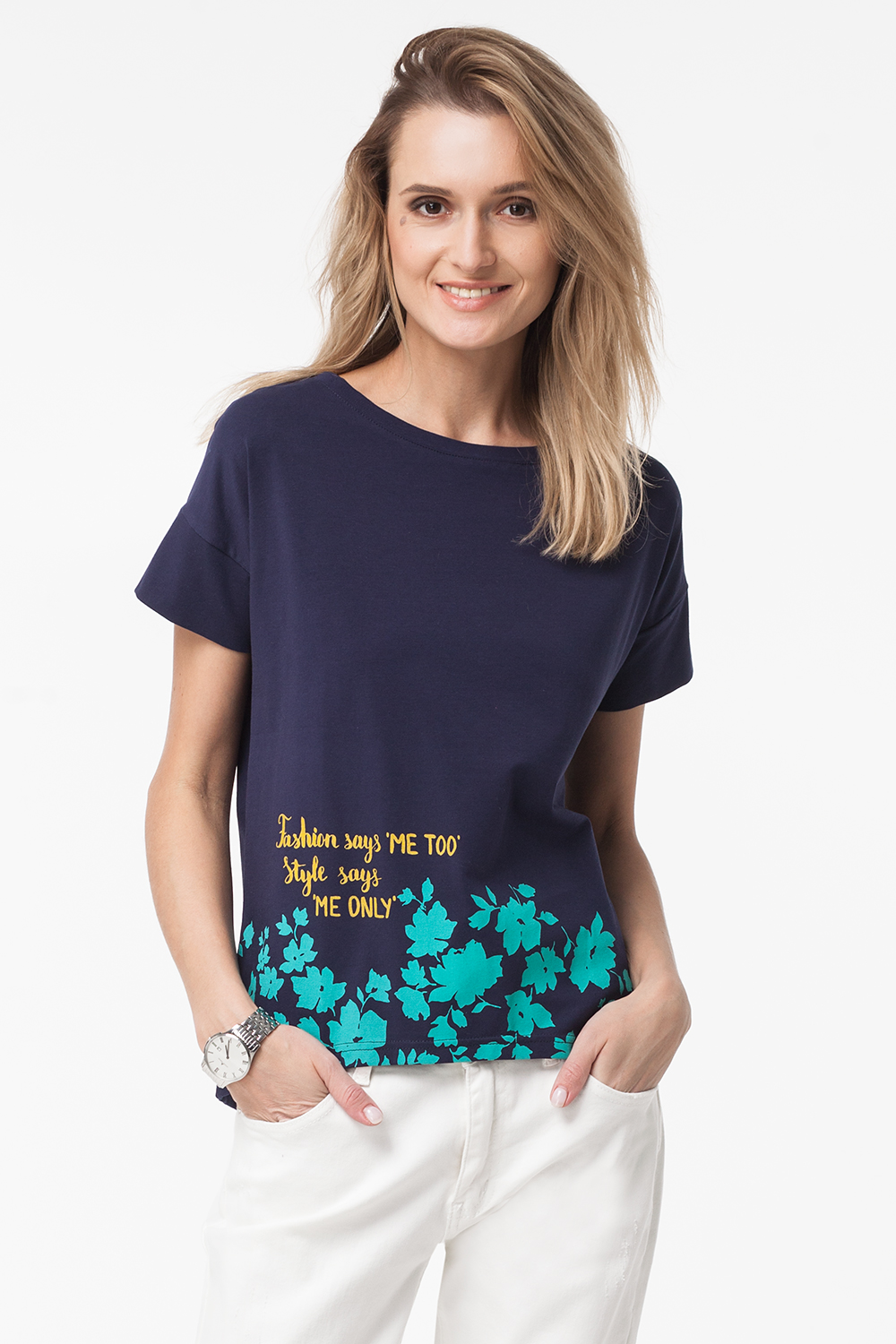 Футболка выполнена из эластичного хлопкового полотна. Модель с округлым вырезом горловины и спущенным плечом. Спереди декоративный принт. Изделие выполнено в стиле "family look" вместе с футболкой для девочки F49.387