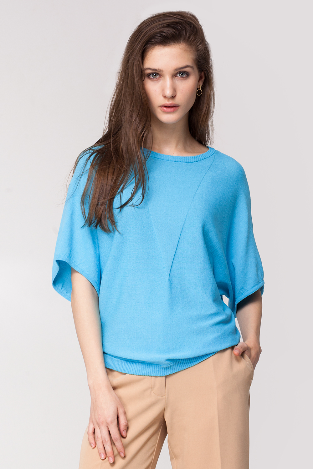 Джемпер свободного покроя с заужением к низу выполнен из гладкой вискозной пряжи с добавлением нейлона для меньшей сминаемости. Спереди декоративно вывязанный треугольник, цельнокроеный рукав с фигурным вырезом. Низ изделия вязан резинкой.