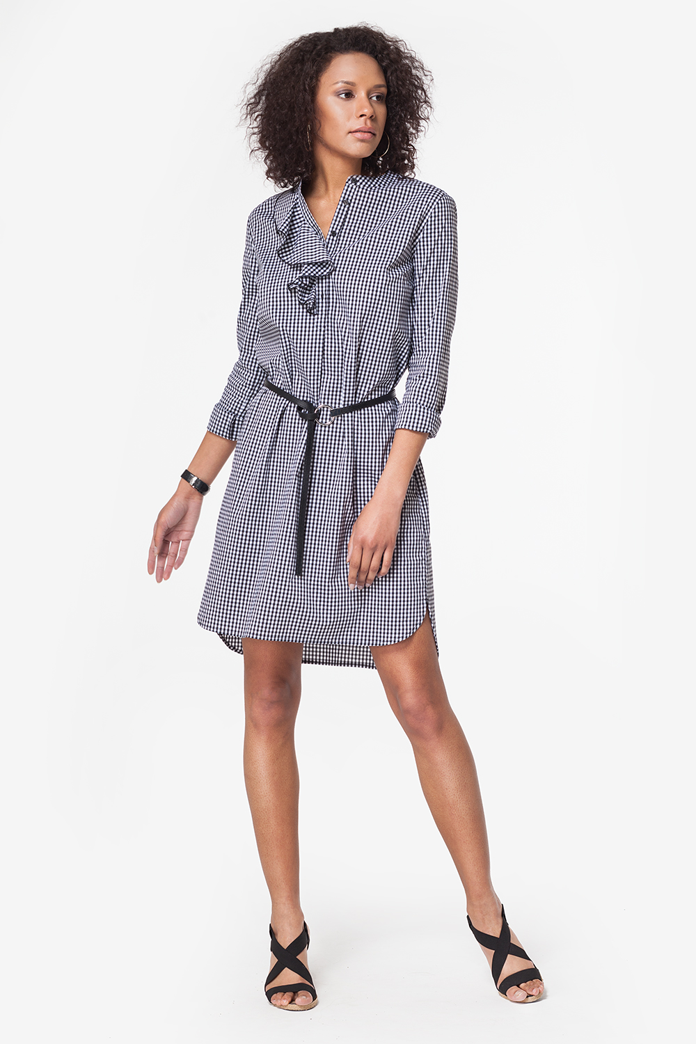 Платье-рубашка выполнено из эластичного хлопкового полотна в мелкую клетку <<Виши>>. Узкий воротник-стойка. Спереди платье украшает отделка - жабо. Ремешок в комплекте.